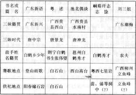 七 两粤传说 粤俗好歌,明时已如此(据钟敬文先生引明屈大均《广东新语·粤歌条》)。因此有歌仙刘三妹的传说。钟先生说:“明清人的记载中,颇有涉及之者。在一部分的民众口中,现在还是乐道不衰。”(《民间文艺丛话》九一页)他又说,这个传说的记载,似以《广东新语》为较早(同书同页)。此书第八卷“刘三妹”条云:“新兴女子有刘三妹者,相传为始造歌之人。唐中宗年间,年十二,淹通经史,善为歌。千里内闻歌名而来者,或一日,或二三日,卒不能酬和而去。三妹解音律,游戏得道。尝往来两粤溪峒间,诸蛮种类最繁,所过之处,咸解其语言。遇某种人,即依某种声音作歌与之唱和,某种人奉之为式。尝与白鹤乡一少年,登山而歌,粤民及傜僮诸种人围而观之,男女数十百层,咸以为仙。七日夜歌声不绝,俱化为石。土人因祀之于阳春锦石岩。岩高三十丈,林木丛蔚,老樟千章,蔽其半,岩,口有石磴,苔花绣蚀,若鸟迹书。一石状如九曲,可容卧一人,黑润有光,三妹之遗迹也。月夕,辄闻笙鹤之声。岁丰熟,则仿佛有人登岩顶而歌。三妹,今称‘歌仙’。凡作歌者,毋论齐民与傜、僮人,山子等类,歌成必先供一本祝者藏之,求歌者就而录焉。不得携出。暂积遂至数箧。兵后,今荡然矣。”这个传说见于他书的,与此稍有异同。钟先生曾作一表,今照录: