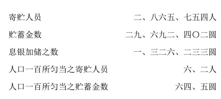 贮金创开之岁至其年末,有寄贮者仅一千八百余人。其寄贮之数共一万五千余圆。明治三十五年,邮便贮金,除台湾外,其数如下。