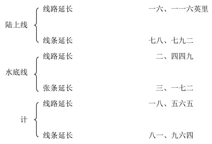 水底线之过河湖者十一处,其布海洋者四十六处。海底线最长者自日本本土,至台湾,约一千二百二十九英里(系明治三十年所布置)。