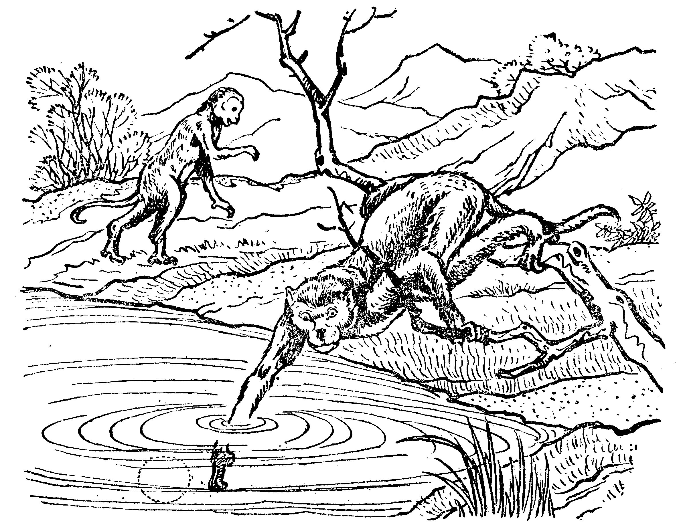 “真的,月亮在这里了!”母猴也喜欢的说:“你等着,我去拿了来。”